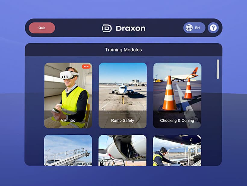 Select from a growing library of standardized VR training modules, built for ground handling operations. Each module can be launched instantly from the headset.